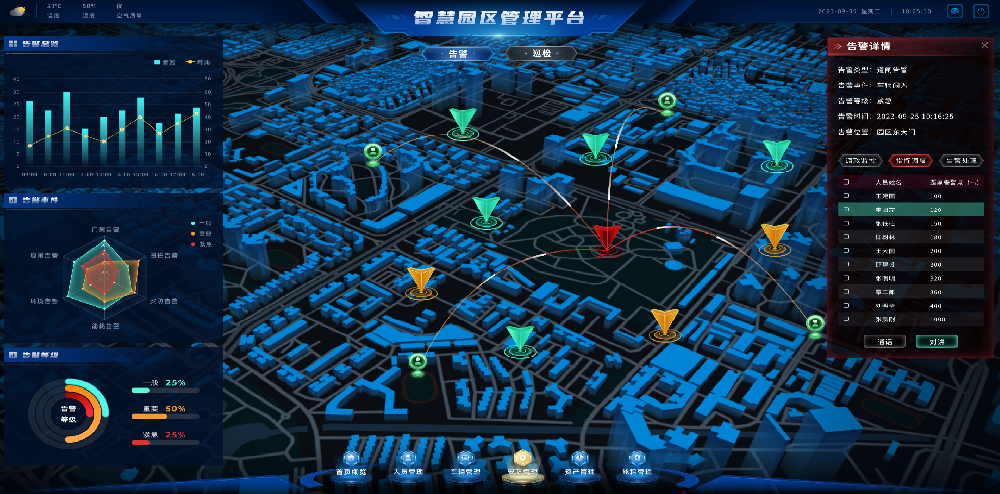 场景三:安防报警,指挥调度:园区人、车、事、物全要素多维度实时监测分析,支持各类告警事件自动感知、智能分级预警、一键查看/定位、搜索,实现各领域告警事件的综合管理;并可根据应急预案流程智能化进行事件自动分类/派单、一键指挥调度。